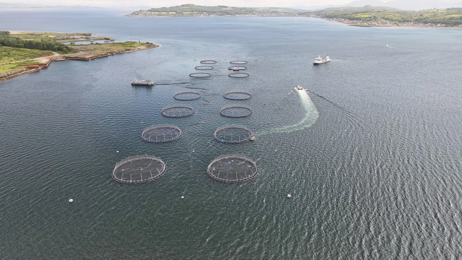 Vue aérienne de la ferme à saumon d'Ardyne, en Écosse. Les formes concentriques des cages apparaissent en surface comme des cercles.