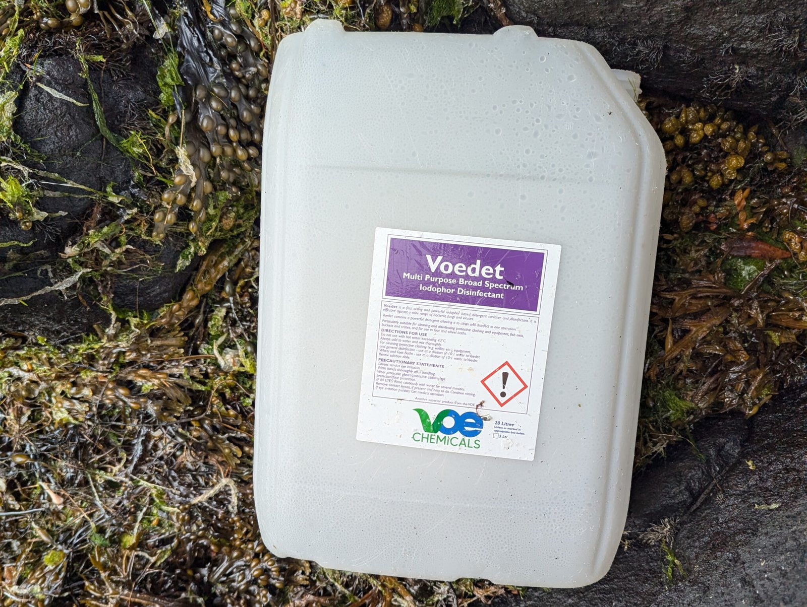Un bidon vide de 20 litres de désinfectant a été retrouvé sur la rive près de Fiunary, en Écosse le 09 juillet 2024, quelques jours après le naufrage d'un navire de travail salmonicole.